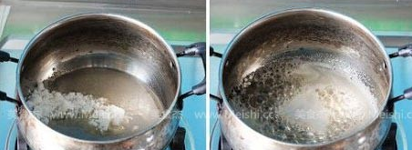 1:先把鍋刷干凈,在鍋里放入糖后,倒入30克冷水;將鍋用小火加熱。隨著熱度上升,糖會(huì)漸漸溶解,并開始冒出小泡,加熱的過程中不需要攪拌,切記!