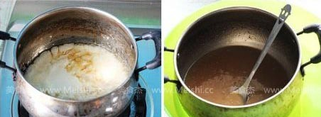 3:我們會(huì)慢慢的發(fā)現(xiàn),直到糖的顏色開始改變,出現(xiàn)黃色時(shí),輕輕搖晃小鍋,讓糖的顏色變得均勻,保持小火加熱,直到糖的顏色越來越深,注意千萬別把糖燒糊了。